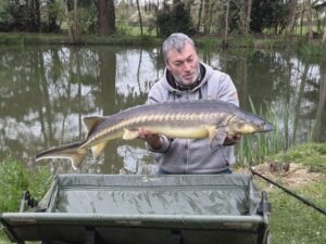 Among the lake’s more unusual residents you’ll find “Crackles,” a striking 34lb+ koi carp, and “Geezer,” a majestic diamond‑back sturgeon that never fails to impress. There’s also a modest population of zander, pike, and perch, plus a few remaining roach to keep the ecosystem lively and balanced.